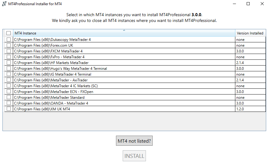 4) A new window will open. You'll be able to select which MT4 instances you want to install.